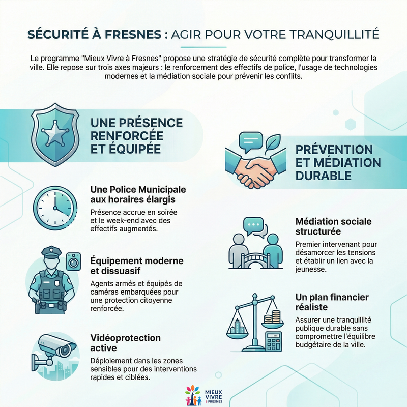 Parce que votre sécurité est la première des libertés, nous mettrons en œuvre ce plan de manière responsable et réaliste, pour que chaque mesure garantisse une paix durable sans compromettre l’équilibre budgétaire de notre ville.